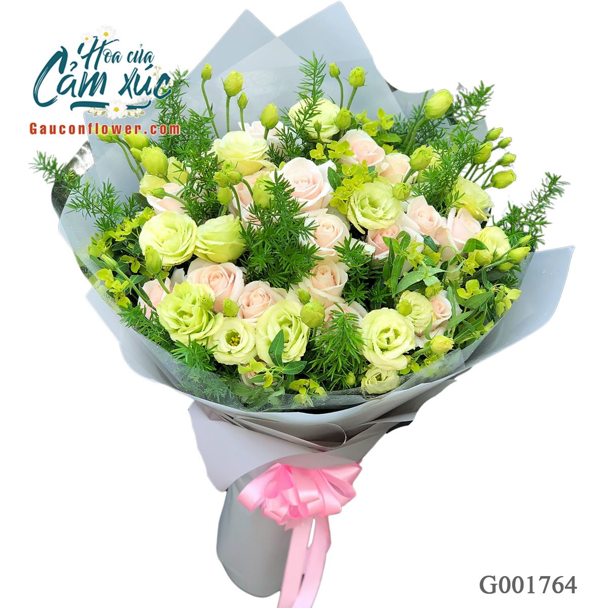 👉Quy cách: hoa cát tường xanh, hồng kem, hoa lá phụ theo mùa