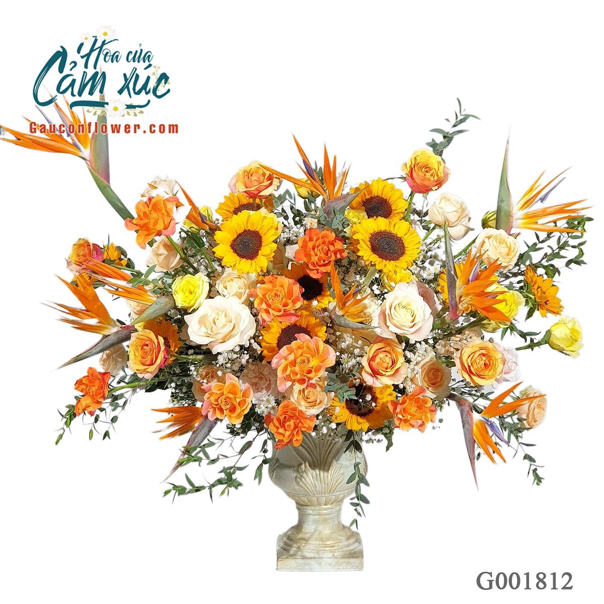 👉Quy cách: hoa hướng dương, hồng cam, thiên điểu, hồng kem, hoa lá phụ theo mùa