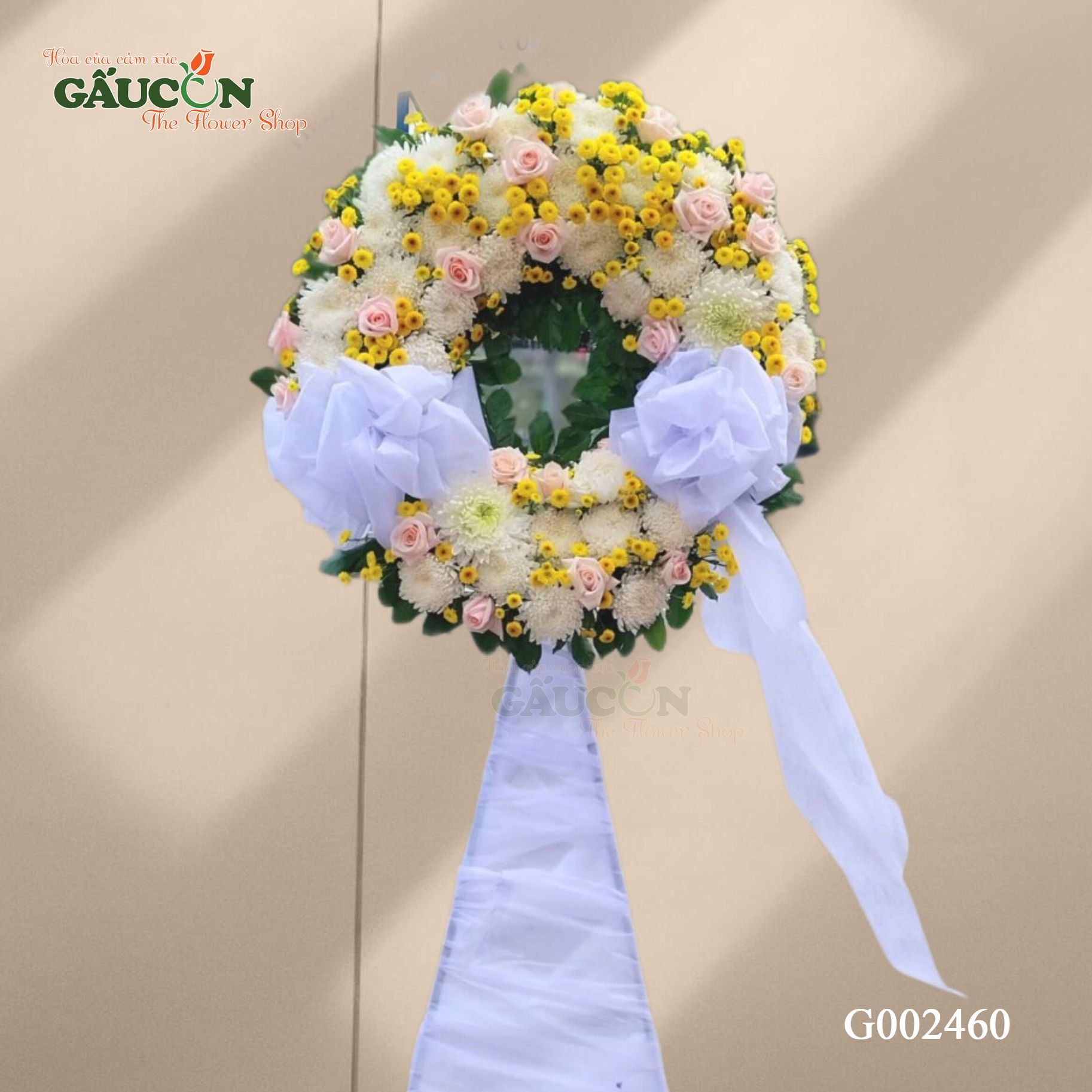 Thành phần sản phẩm: Hoa cúc trắng, cúc vàng, hồng kem...