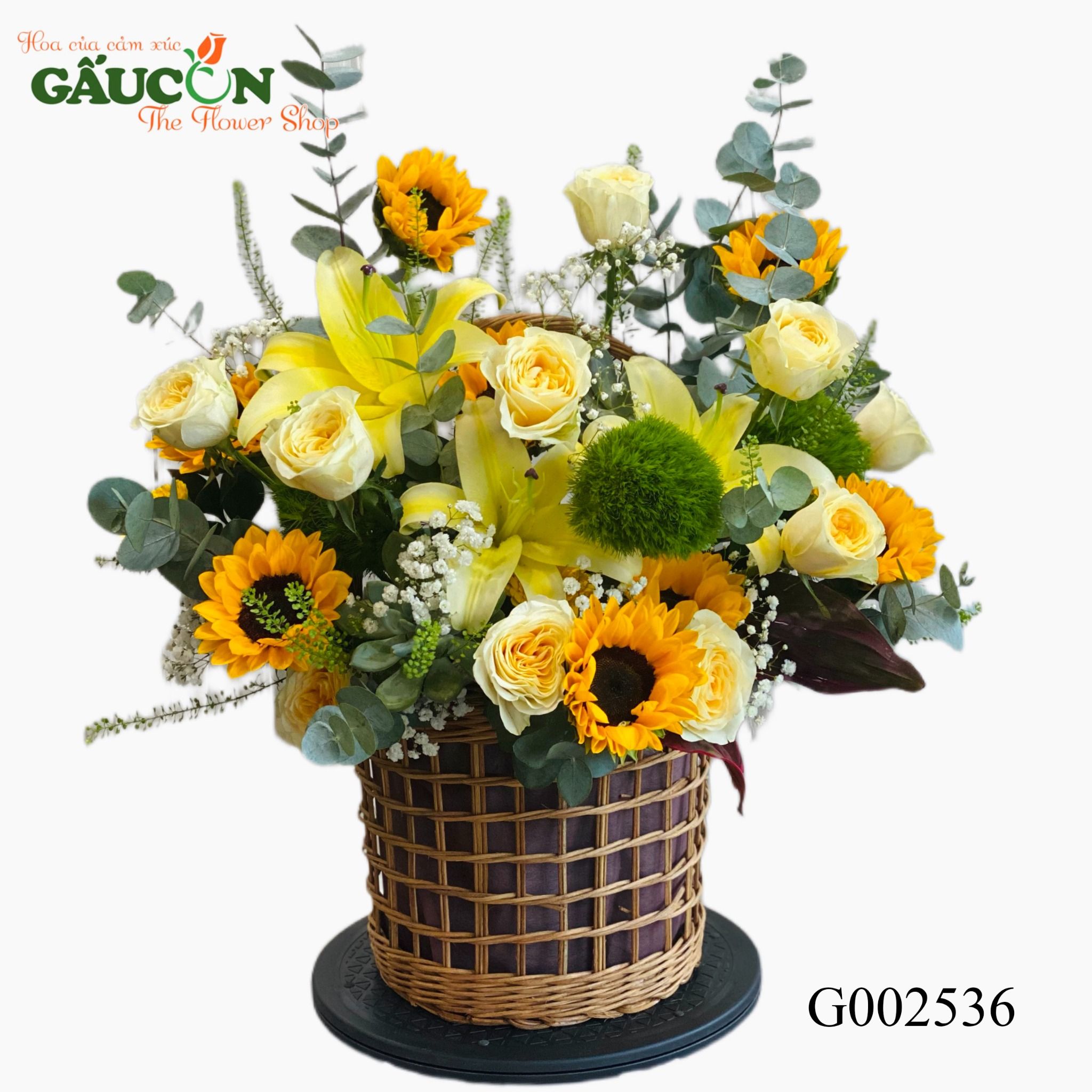 👉Quy cách: hoa hồng vàng, ly vàng, hướng dương, hoa wisky xanh, hoa lá phụ theo mùa