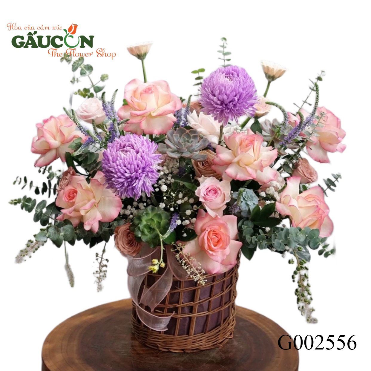 👉Quy cách: hồng song hỷ, sen đá, cúc mẫu đơn tím, hoa lá phụ theo mùa...