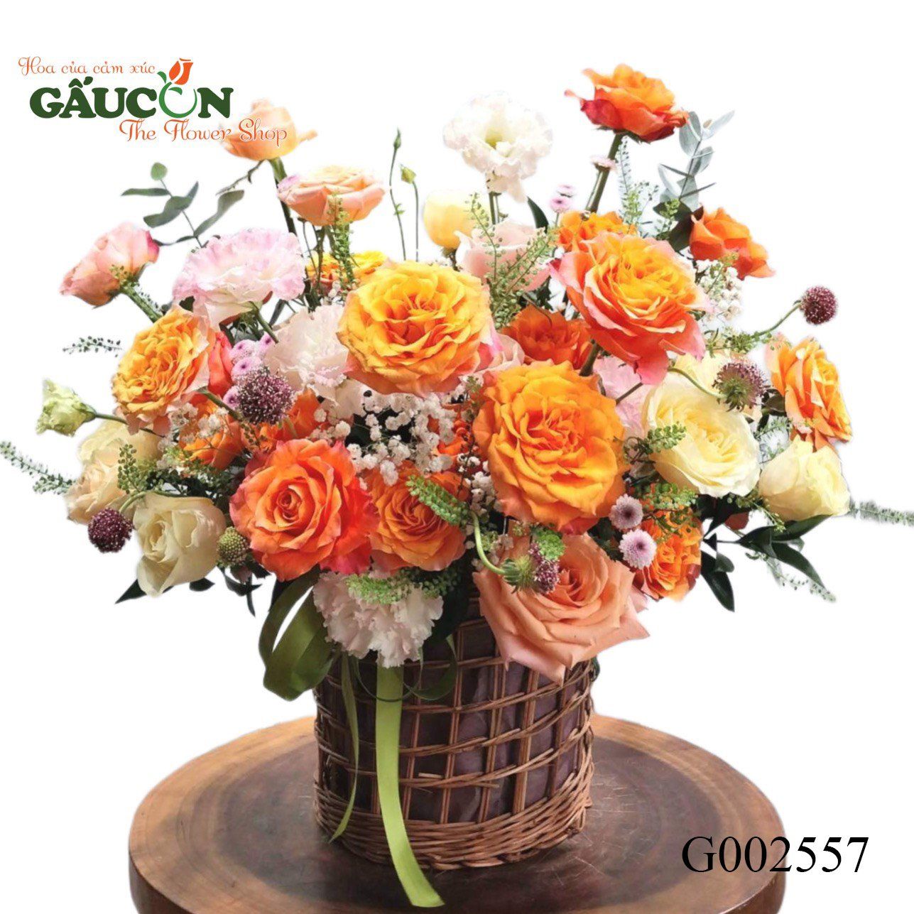 👉Quy cách: hồng cam, cát tường, hồng vàng, hoa lá phụ theo mùa...