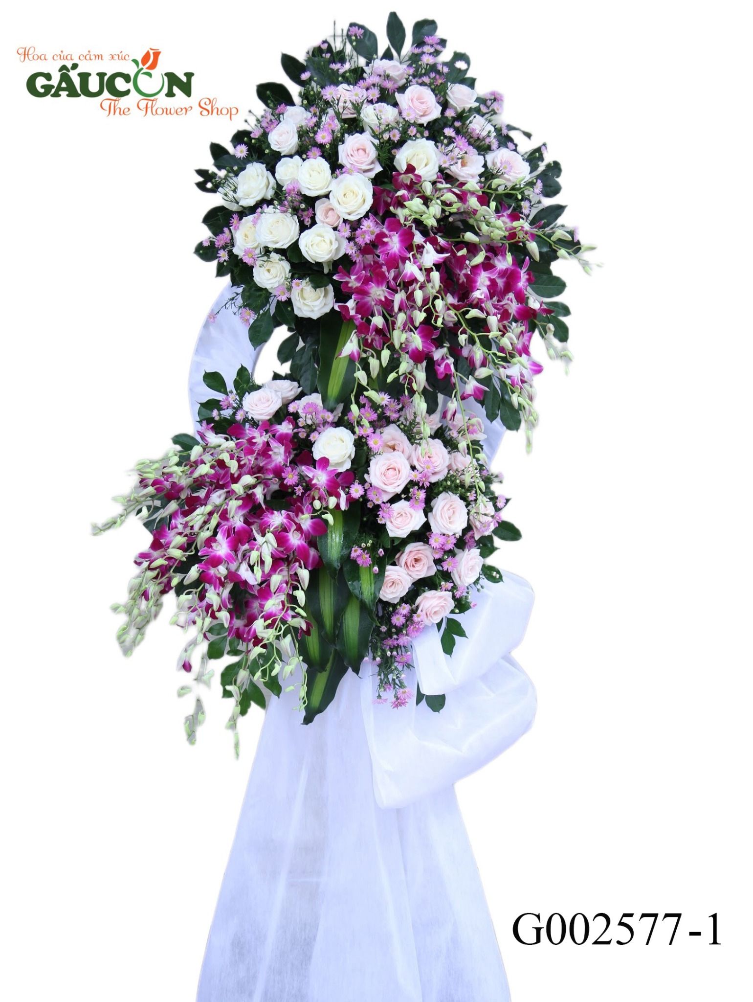 👉Thành phần: hoa hồng kem, lan thái tím, hoa lá phụ theo mùa....