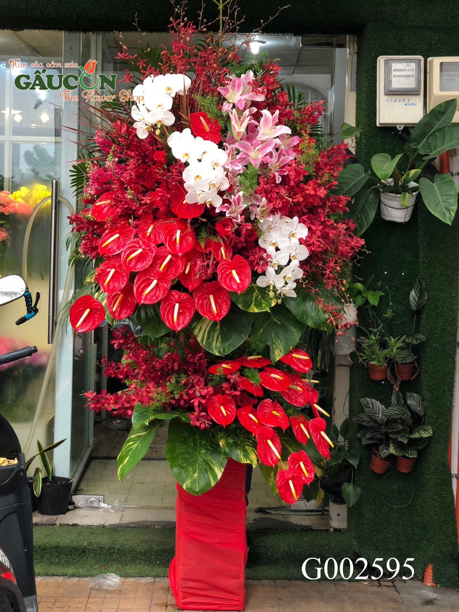 👉Quy cách: hoa lan mokara đỏ, lan bò cạp đỏ, hoa môn đỏ, hồng đỏ, hoa lily hồng, lan hồ điệp trắng, hoa lá phụ theo mùa...