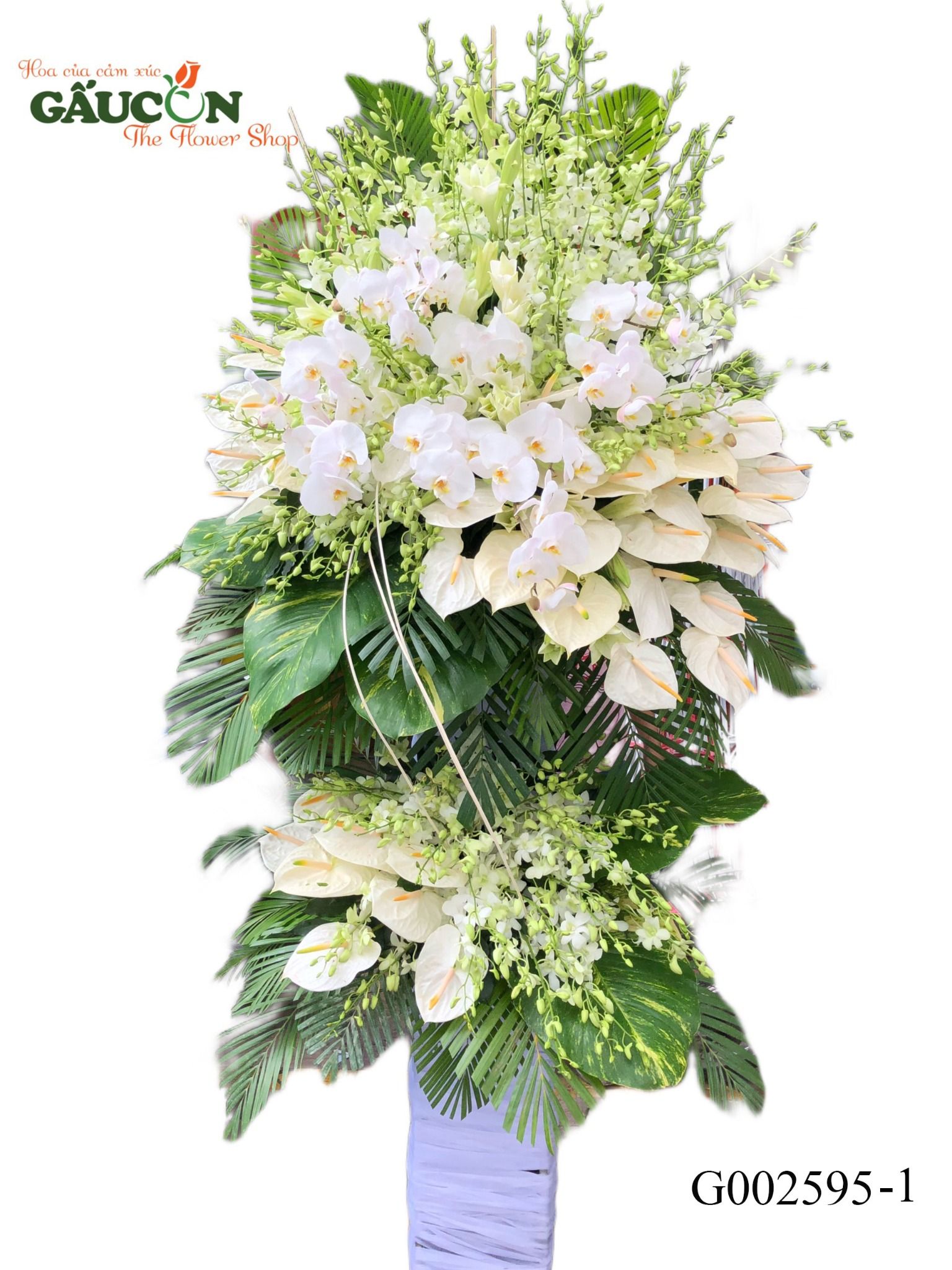 👉Thành phần: hoa môn trắng, lan thái trắng, hồ điệp trắng, hoa lá phụ theo mùa....