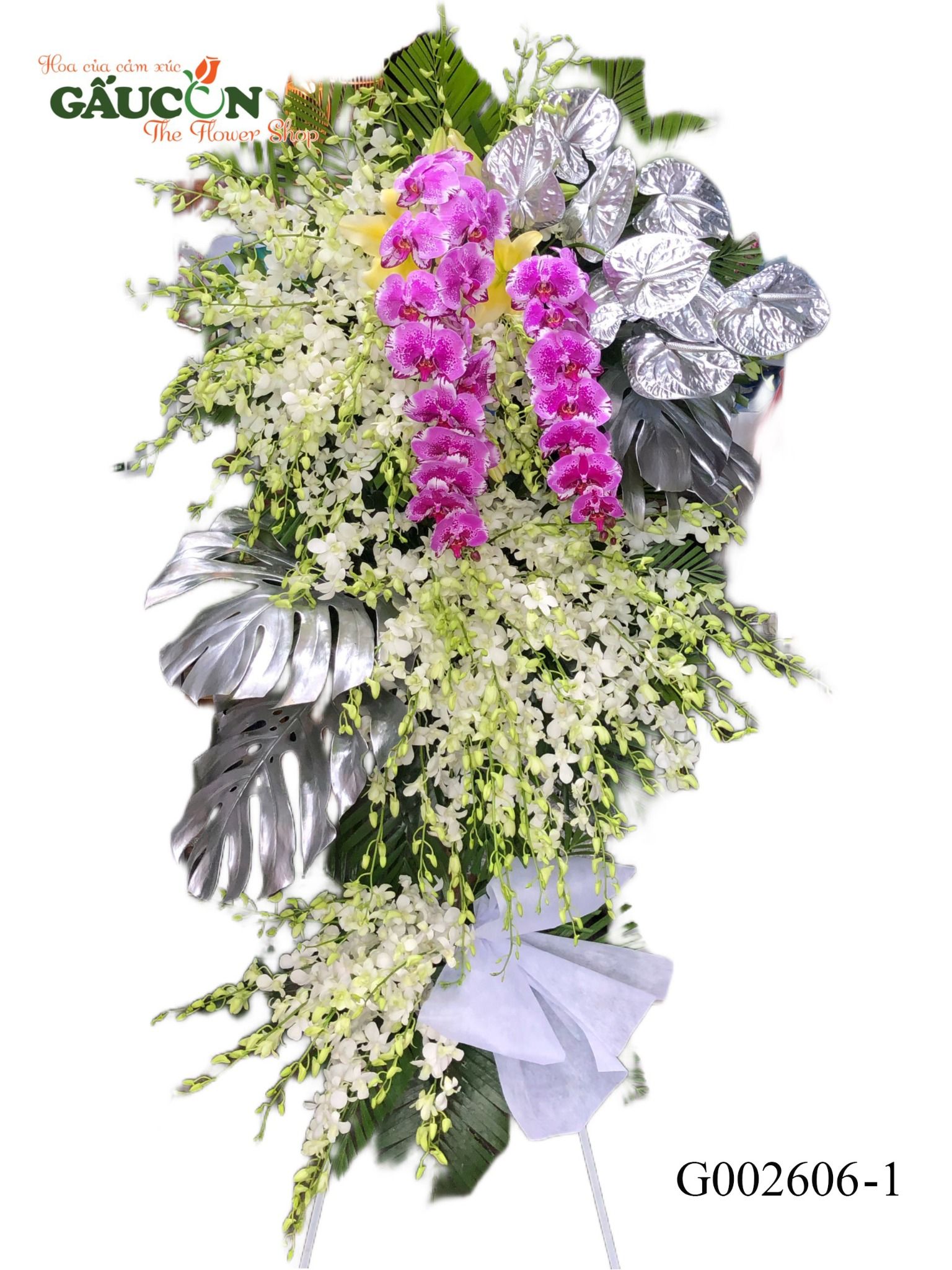 👉Thành phần: hoa lan thái trắng, hồ điệp tím, môn trắng hoa lá phụ theo mùa....