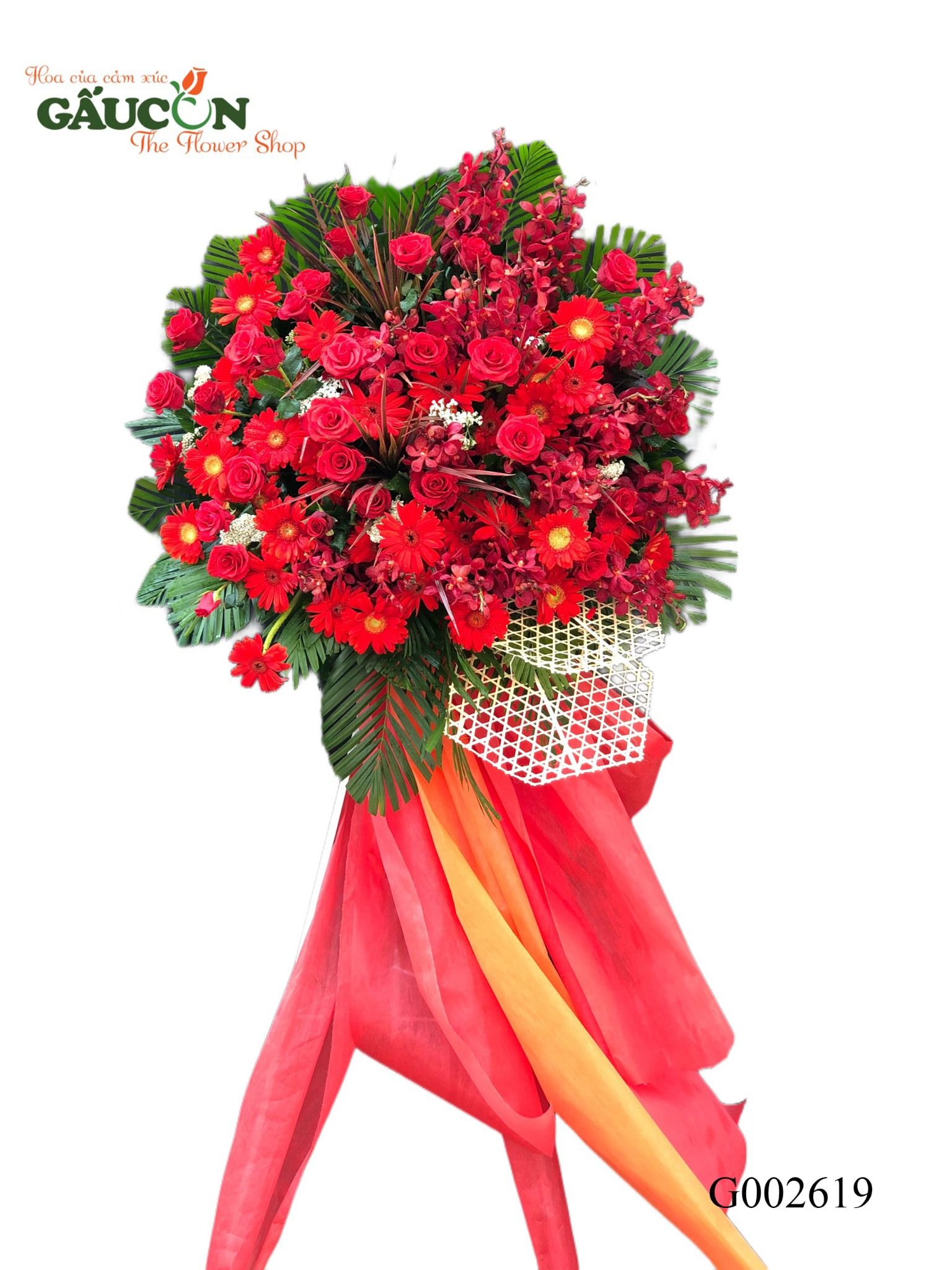 👉Quy cách: hoa hồng đỏ, đồng tiền đỏ, lan mokara đỏ, hoa lá phụ theo mùa...👉Size: cao 1m6 - 2m x ngang 0m8 - 1m