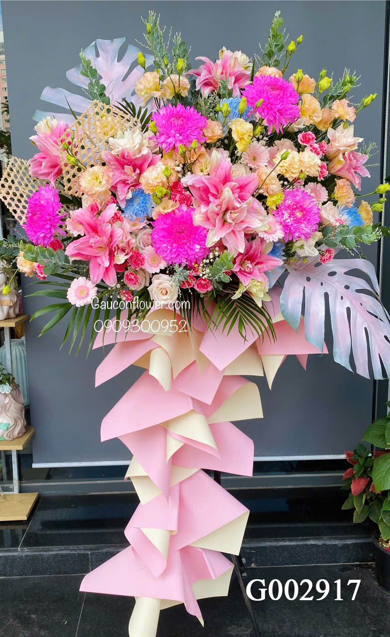 👉Quy cách: hoa cúc mẫu đơn hồng, hoa ly kép, hoa cát tường, hoa lá phụ theo mùa👉Size: cao 1m6 - 2m x ngang 0m8 - 1m